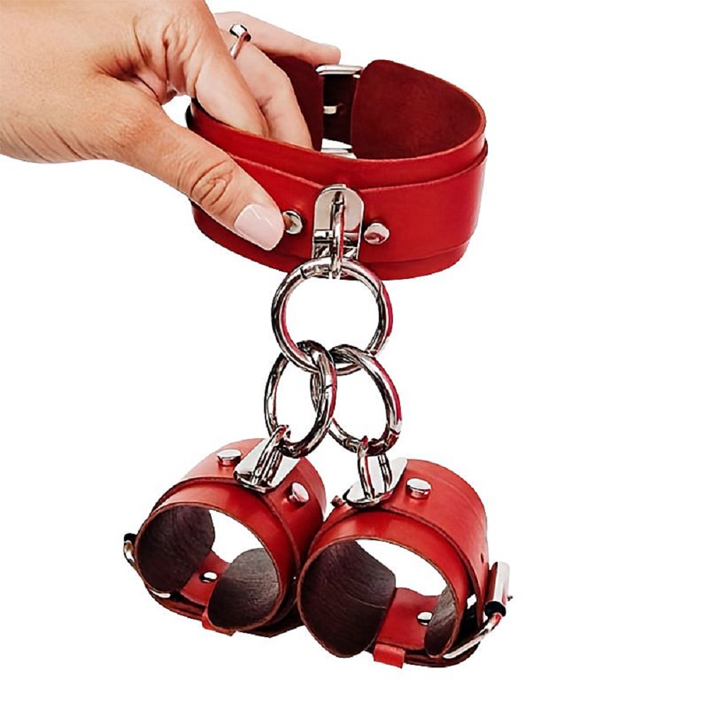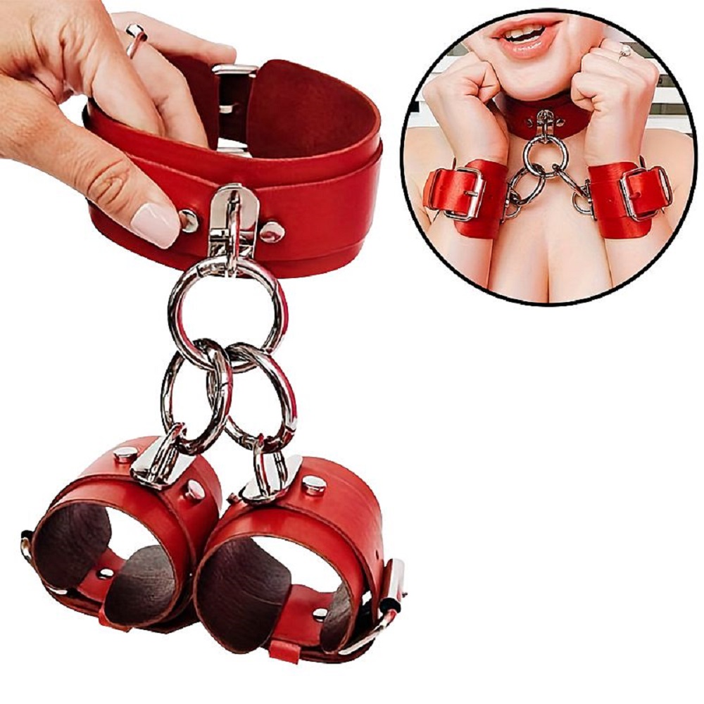 Coleira bondage ajustável por meio de fivelas metálicas, confeccionada em couro sintético.
